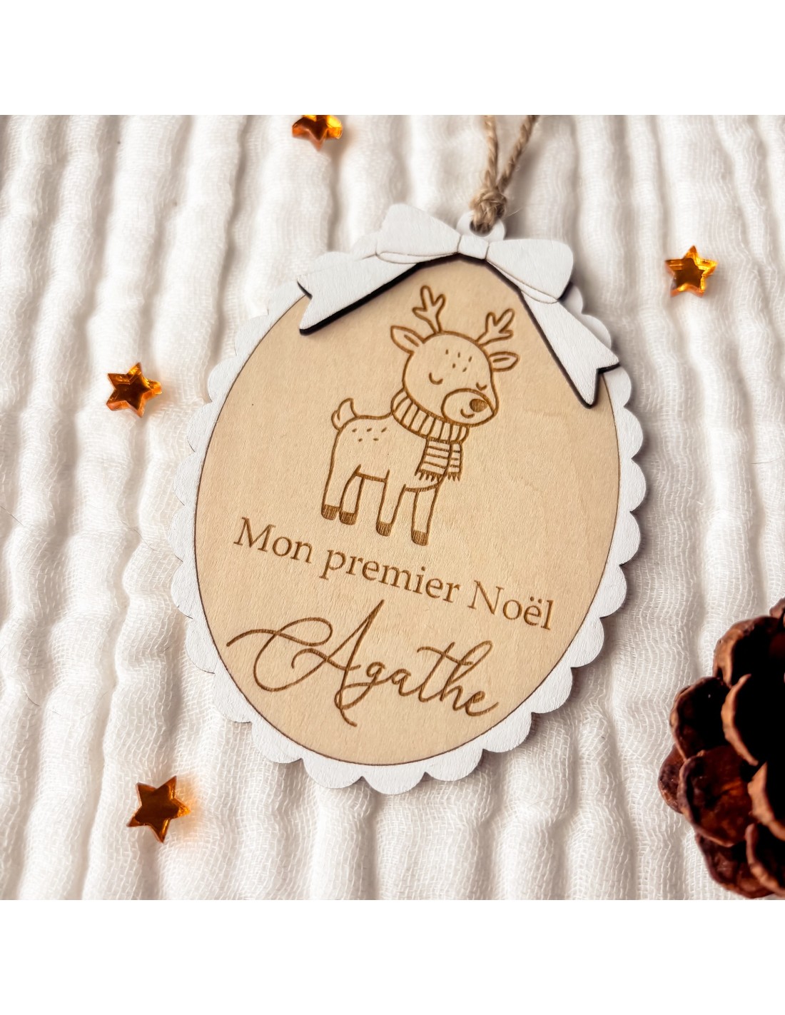 Cette jolie boule en forme de médaillon est gravée sur bois avec un petit renne et le prénom de l’enfant. Le texte peut être adapté : “Mon premier Noël”, “Joyeux Noël” ou simplement le prénom.