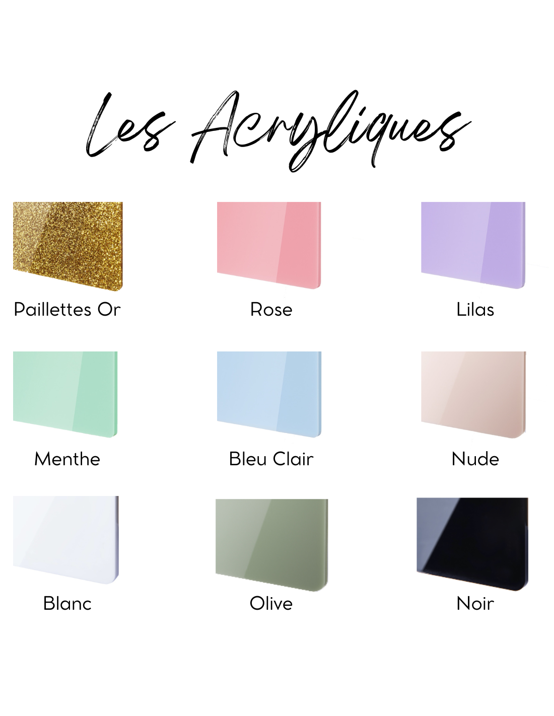 - Prénom ou mot dans l'acrylique de votre choix (sur l'exemple photo le prénom a été gravé, se referrer aux autres produits pour voir des exemples d'acrylique)